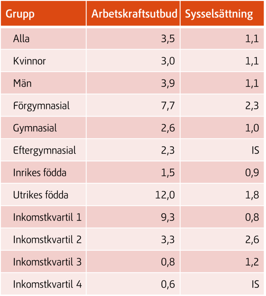 Tabell: reformeffekten på arbetskraftsutbud och sysselsättning i procentenheter