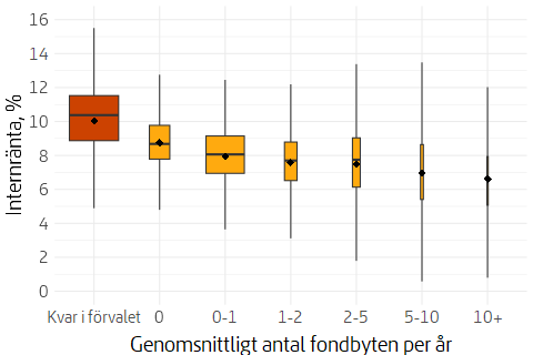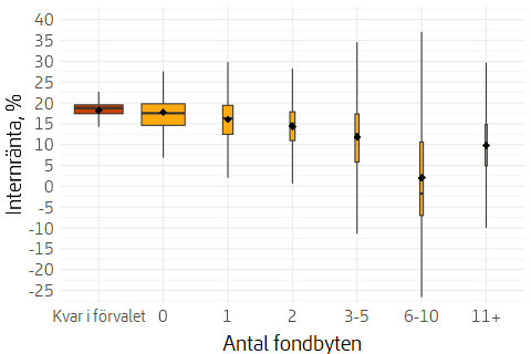 Lådornas övre och nedre gräns motsvarar 75:e respektive 25:e percentilen för den genomsnittliga värdeutvecklingen per antal fondbyten. Det horisontella strecket markerar medianen och romben medelvärdet. De vertikala strecken som utgår från lådorna bestäms av intervallet av värden för värdeutvecklingen mellan den 25:e och 75:e percentilen multiplicerat med 1,5. Det motsvarar ungefär 1:a respektive 99:e percentilen om observationerna är normalfördelade. Observationerna som är större respektive lägre än dessa värden betraktas som s.k. uteliggare och redovisas inte i figuren. Lådornas bredd är en funktion av antalet observationer som respektive grupp utgör.