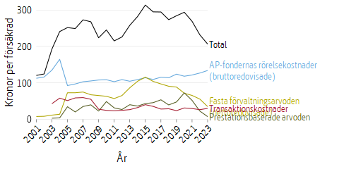 År 2023 var rörelse- och förvaltningskostnaderna totalt för Första–Fjärde AP-fonden och Sjätte AP-fonden cirka 0,08 procent av fondernas genomsnittligt förvaltat kapital. AP-fondernas prestationsbaserade arvoden uppgick till 0,00 procent, och transaktionskostnader uppgick till 0,01 procent av förvaltat kapital. Kapitalförvaltningskostnaderna och avgifter uppgick därmed efter avrundning till totalt 0,10 procent av förvaltat kapital. Det är viktigt att ha i åtanke att fondernas nettoförvaltningskostnader samt transaktionskostnader redan har påverkat fondernas värdeutveckling negativt.