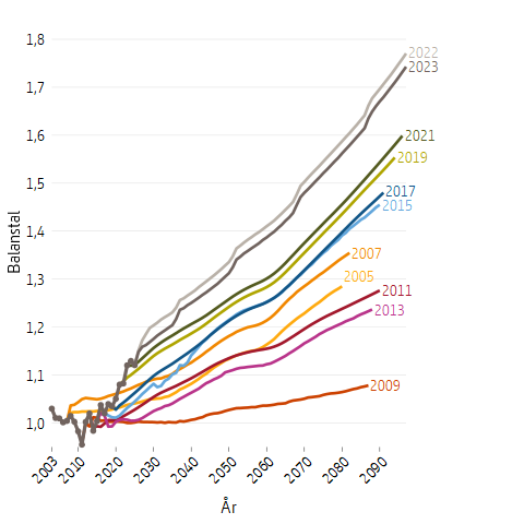Balanstalet för 2010, som beräknades med uppgifter för år 2008, var under ett vilket innebar att en balanseringsperiod inleddes. Tyvärr saknas underlaget till framskrivningarna för år 2008, men det var ingenting i framskrivningarna för år 2005–2007 som tydde på att en balanseringsperiod skulle påbörjas. Framförallt ger 2009 års framskrivningar ett lägre balanstal än övriga år, detta på grund av att utgångsläget var dåligt med stora nedgångar för AP-fonderna och en svag arbetsmarknad. I framskrivningen för 2023 är balanstalet något lägre än 2022. En av anledningarna är att andelen sysselsatta som är 65 år och äldre har skruvats ner något vid höjningar av riktåldern jämfört med föregående år. Detta avspeglas också i figur 14 där man kan se att avgiftsnettot är något lägre för 2023 års framskrivning.