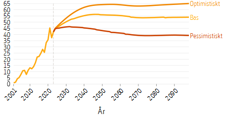 Figur 12 visar den årsvisa reallöneförändringen för perioden 1960–2023. Den genomsnittliga ökningen var 1,6 procent för hela perioden vilket är något lägre än värdet som används i basscenariot. I det optimistiska scenariot är reallönetillväxten 2,0 procent och i det pessimistiska 1,0 procent.